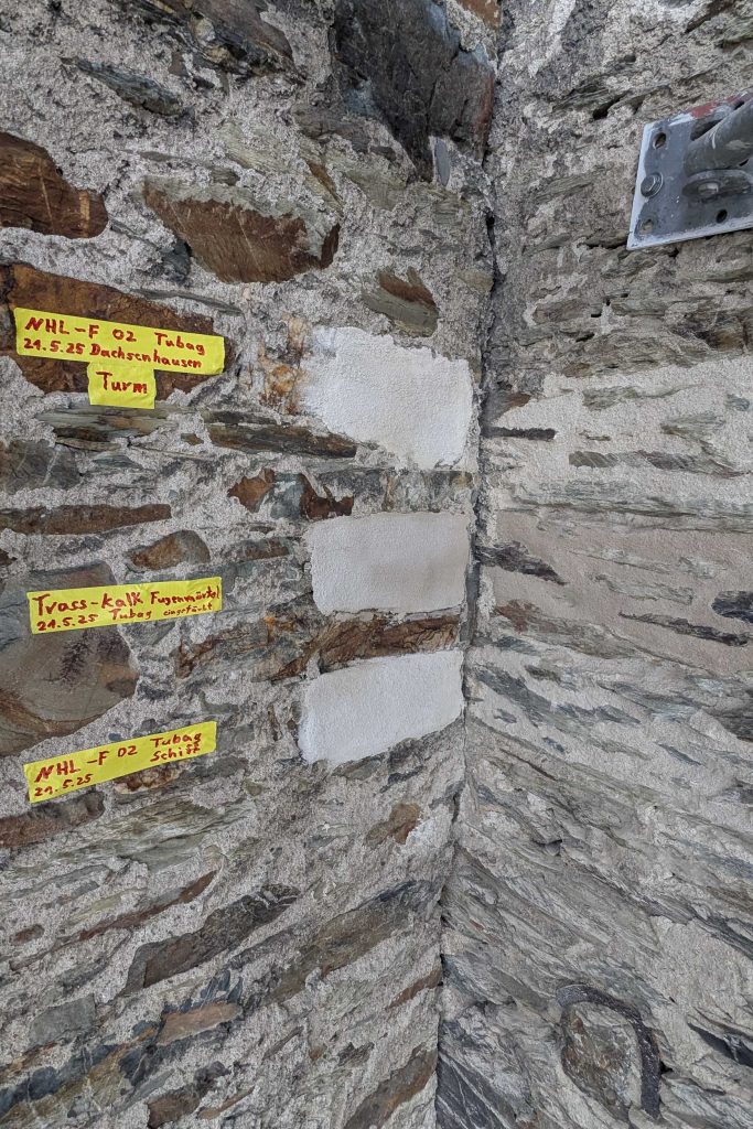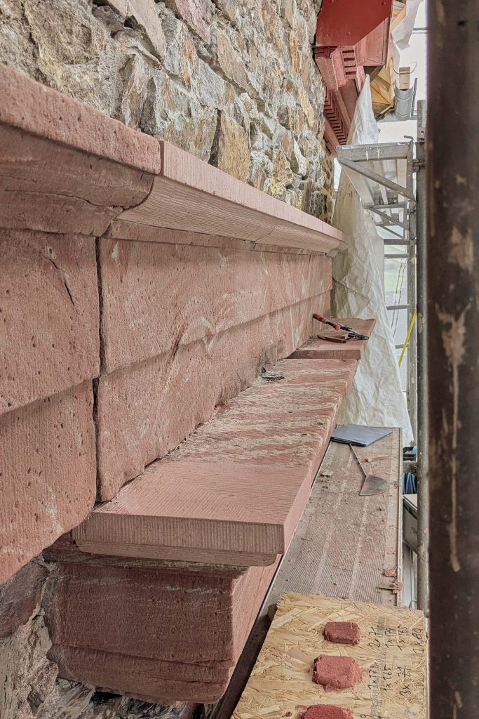 Teile des Mauerwerks bestehen aus Schalstein und sind besonders anfällig für Witterungseinflüsse. Zum Schutz erhielt die Fassade eine neue Verfugung und eine dünne Kalkschlämme, die das Material bewahrt, ohne seine Struktur zu überdecken.
