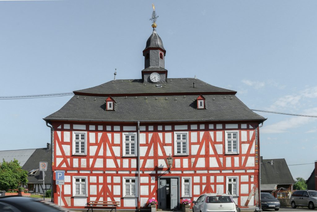 Der historische Rathaus von Rehe liegt südlich der Hauptstraße auf einer kleinen Freifläche, unmittelbar westlich der Abzweigung „Windlück“. Das ehemalige Schulhaus mit Betsaal bildet hier einen markanten baulichen Schwerpunkt. Mit seiner klaren Fachwerkgliederung, den geschnitzten Ständern und dem kleinen, verschieferten Dachturm prägt das Gebäude seit dem 18. Jahrhundert das Bild des Dorfes.